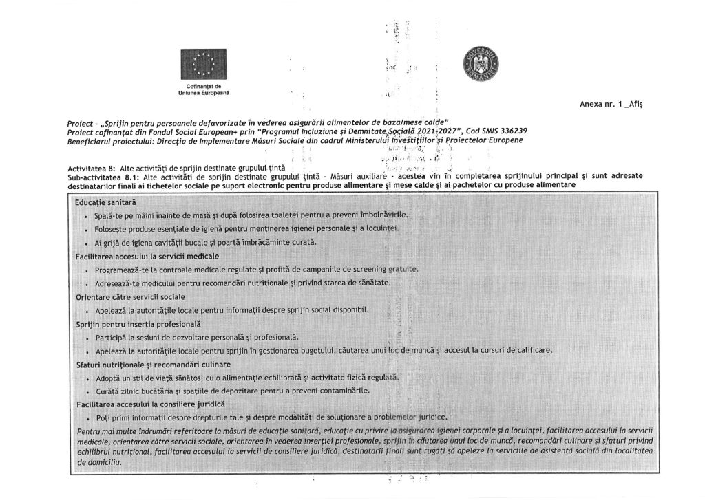 Afiș proiect: ”Sprijin pentru persoanele defavorizate în vederea asigurării alimentelor de bază/mese calde”